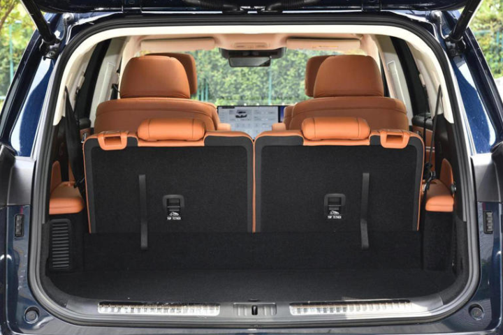 蓝山的后备厢呢,纵深不算大,满载容积有 349 升,但也不算小了,能放下 4 个 20 英寸行李箱,再放点背包啥的没问题。第三排座椅能 50:50 放倒,要是需要装更多东西,放倒第三排就能扩容。